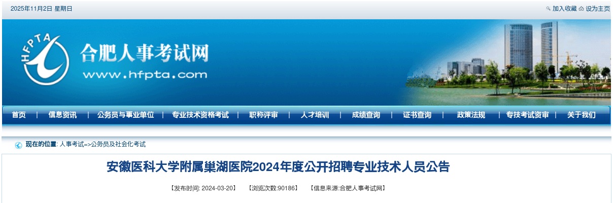 【2024年度安徽医科大学附属巢湖医院公开招聘专业技术人员45人公告】相关岗位: